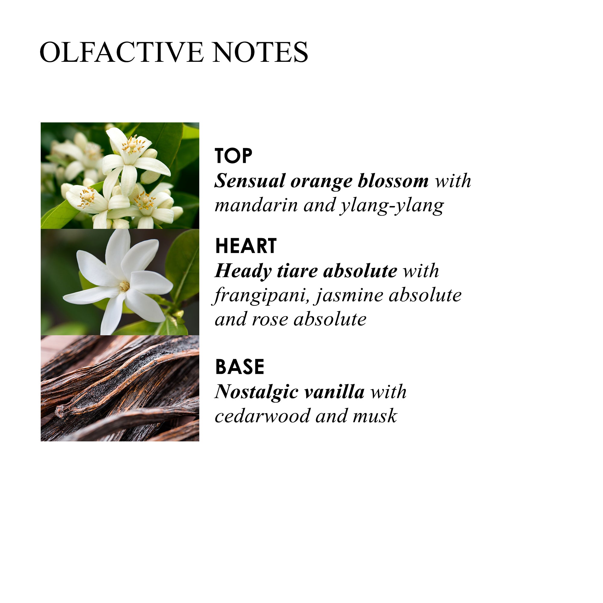 De geur opent met topnoten van bittere amandel, mandarijn en ylang-ylang, die een sprankelende en licht exotische frisheid geven. In het hart bloeien tiarebloesem, jasmijn en neroli, waardoor een rijk en zonnig bloemig karakter ontstaat. De basisnoten van sandelhout, muskus en cederhout voegen een zachte, romige diepte toe, wat de geur perfect afrondt.