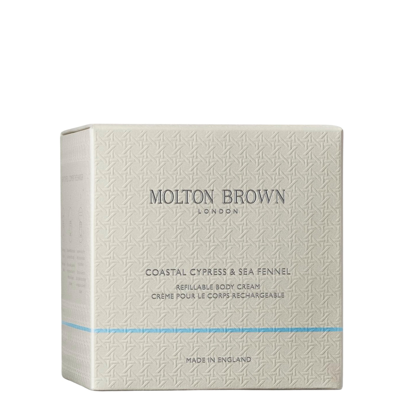 Molton Brown Refillable Body Cream – Coastal Cypress & Sea Fennel is een rijke, romige bodycream die de huid intens voedt en langdurig hydrateert. De formule met cacaoboter en sheaboter trekt snel in, maakt de huid soepel en laat een subtiele glans achter zonder vettig aan te voelen.