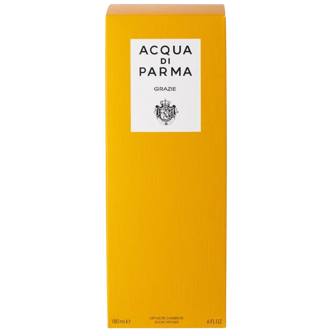 The diffuser is presented in the iconic Art Deco bottle of Acqua di Parma, finished in the Maison's signature yellow hues. The bottle is finished with an elegant cap in the recognizable Acqua di Parma shape and natural black rattan reeds that evenly disperse the fragrance. With a capacity of 180 ml, Grazie will perfume a room for approximately 10 to 12 weeks.