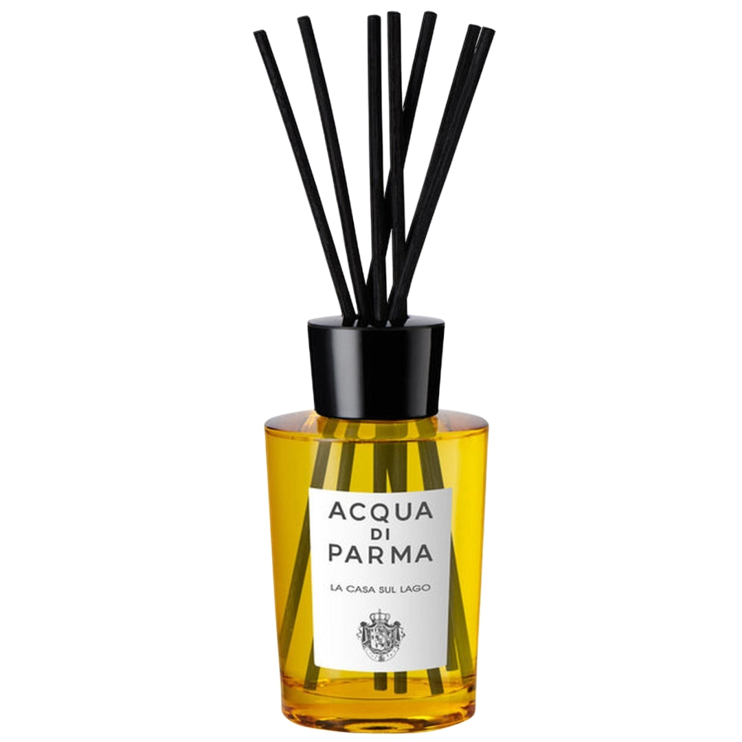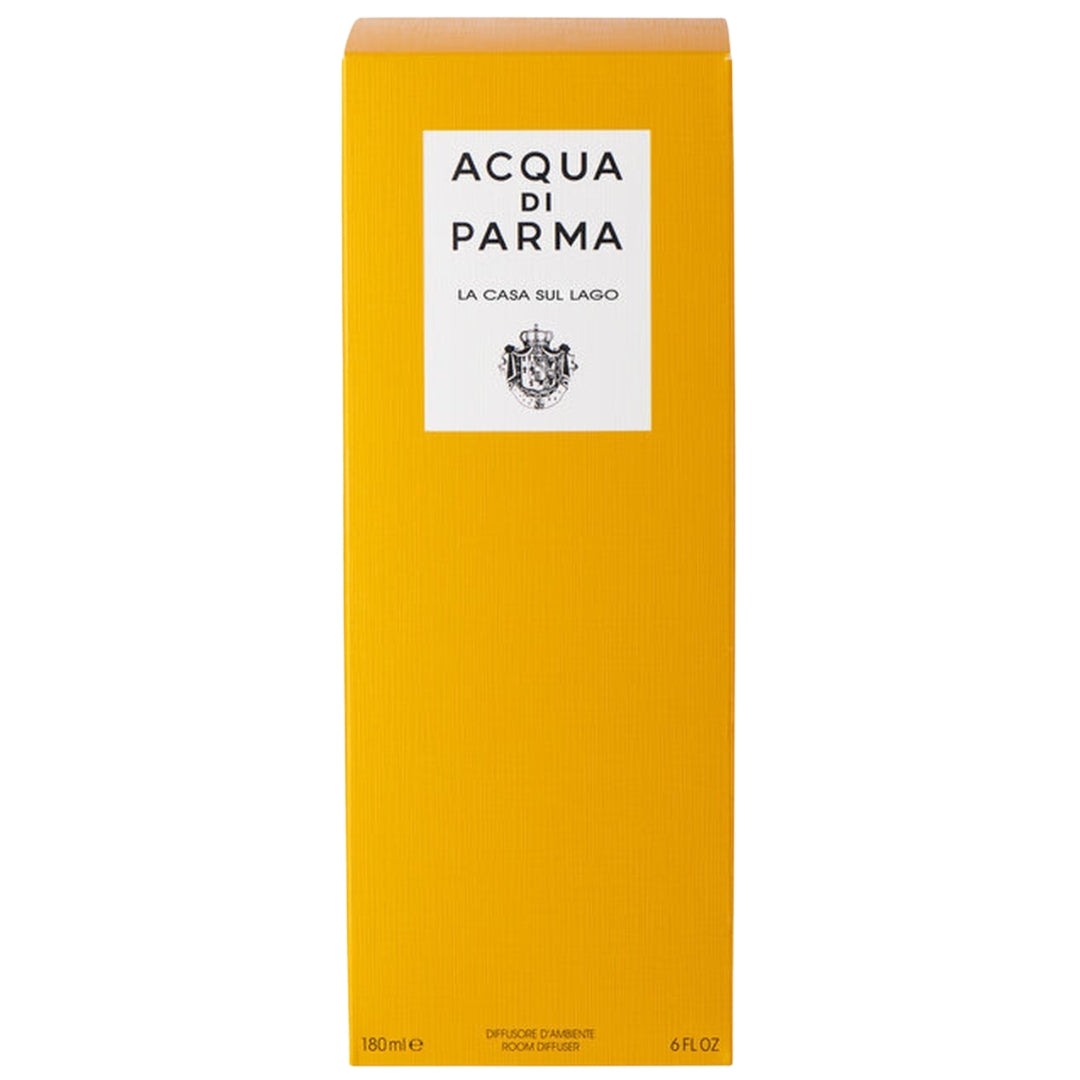 The diffuser is presented in the iconic Art Deco bottle of Acqua di Parma, crafted in the Maison's signature yellow hues. The bottle is finished with an elegant cap in the recognizable Acqua di Parma shape and natural black rattan reeds that evenly disperse the fragrance. With a capacity of 180 ml, La Casa sul Lago will perfume a room for approximately 10 to 12 weeks.