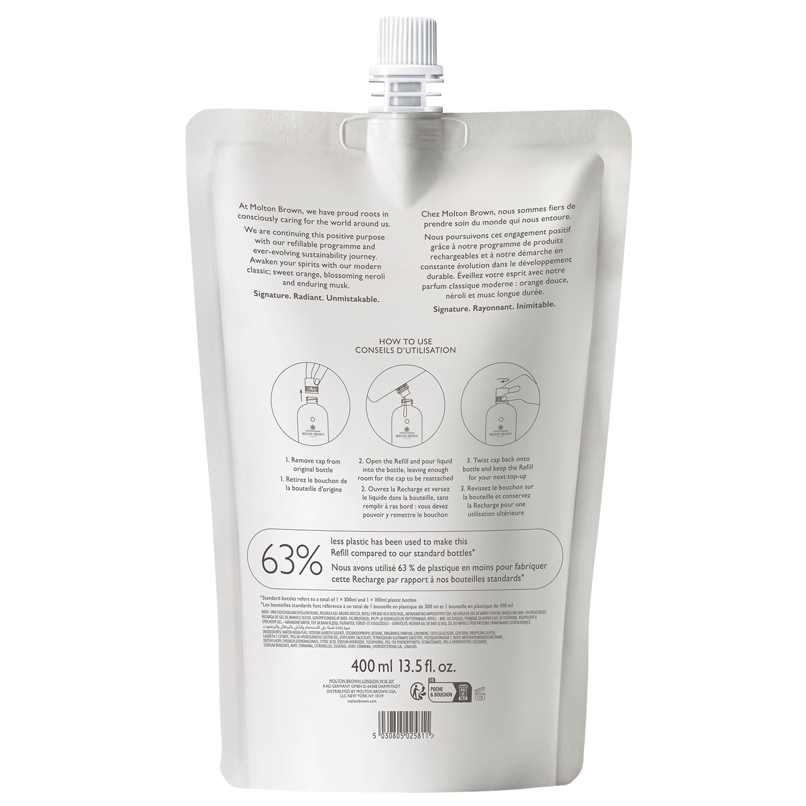 Molton Brown's Orange & Bergamot Bath & Shower Gel Refill is an eco-conscious choice that combines luxury and sustainability. This 400ml refill is specially designed to refill the iconic bottle, allowing you to use significantly less plastic while still enjoying the same high-quality body care.