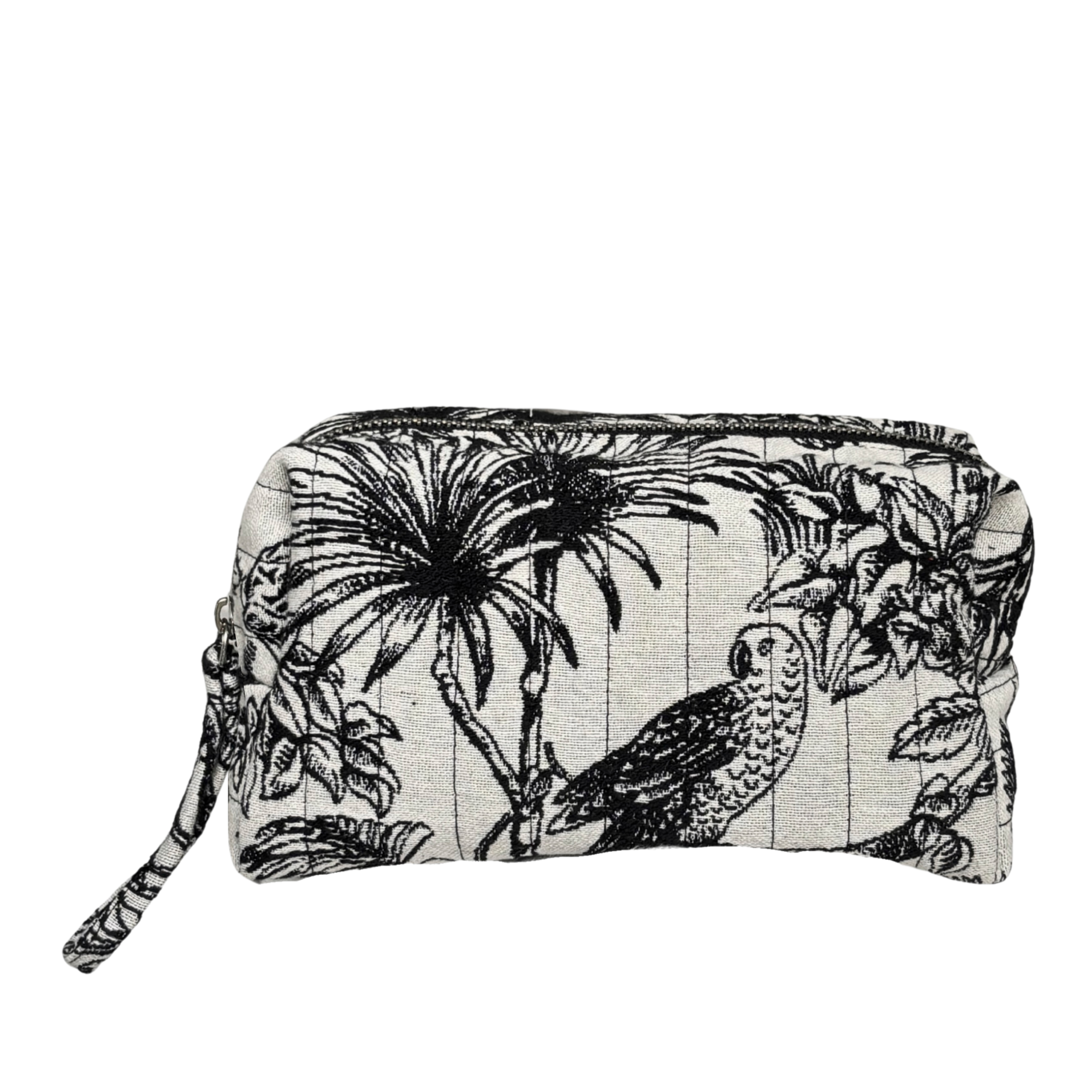 De Safari Black & White Toilettas van Khus belichaamt tijdloze elegantie met een moderne twist. Het contrastrijke jacquardweefsel toont een verfijnd tropisch motief in diepzwart op een natuurlijke, crèmekleurige achtergrond. Het dessin van palmen, papegaaien en exotische bladeren brengt een vleugje verre oorden tot leven, terwijl de monochrome tinten zorgen voor een serene en stijlvolle uitstraling.