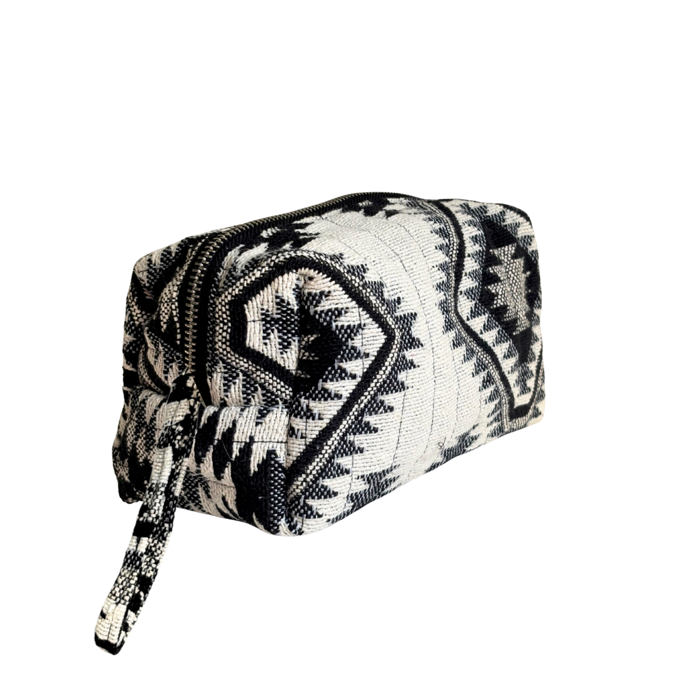 De Western Chic Black & White van Khus is een stijlvolle toilettas die ambacht en design samenbrengt in een opvallend grafisch patroon. Het zwart-witte jacquardweefsel is geïnspireerd op traditionele Western-motieven, vertaald naar een eigentijdse, verfijnde uitvoering. Het geometrische dessin creëert een krachtig contrast, terwijl de natuurlijke tinten het geheel een tijdloze elegantie geven.